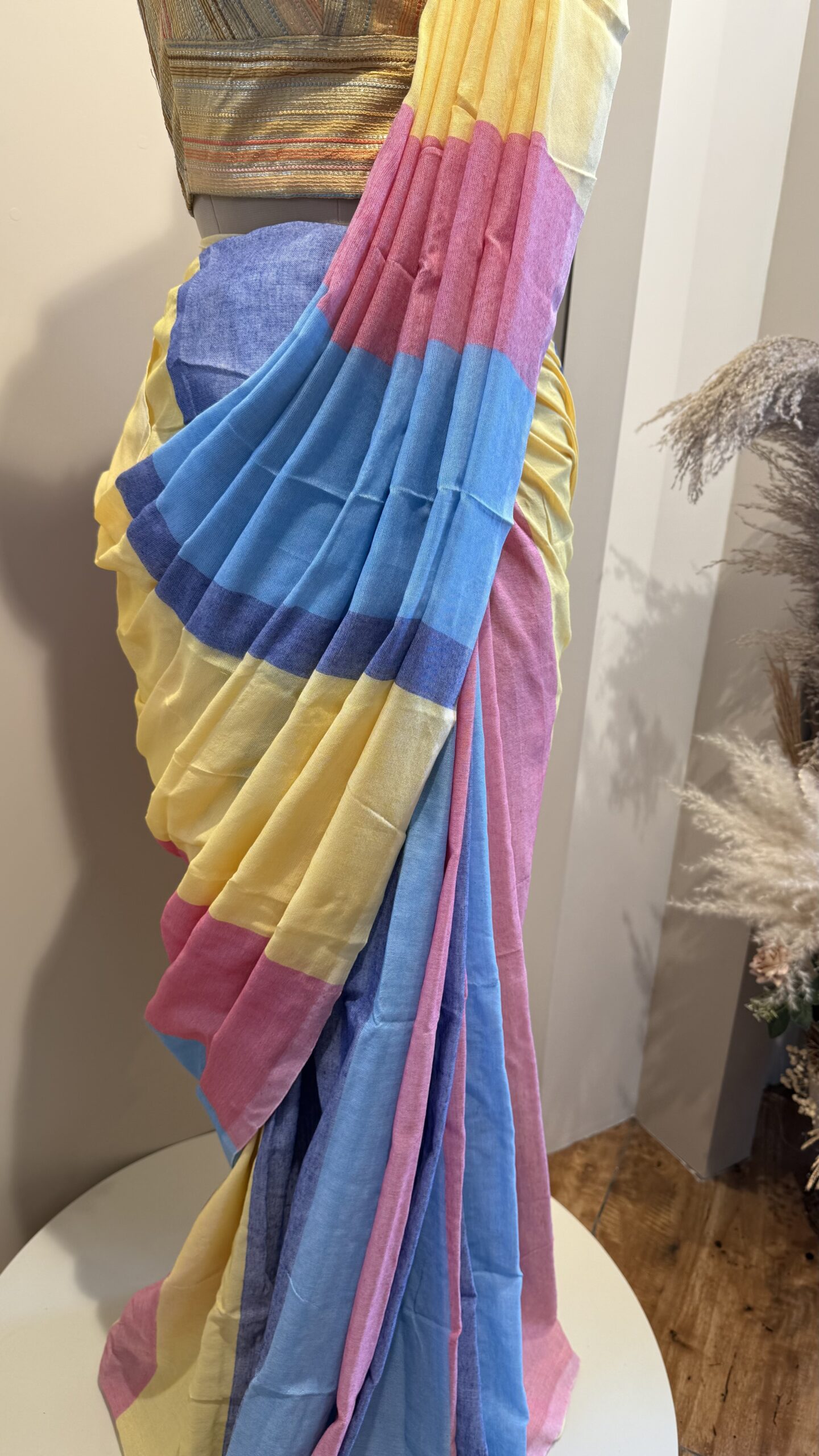 A celebration of soft hues and timeless charm, this handwoven saree features an elegant blend of pastel yellow, serene blue, and blush pink in broad, graceful stripes, comes with plain Yellow running Blouse.  Crafted from fine cotton, it exudes a luxurious lightness and fluid drape—perfect for elevating your daytime elegance or adding a refined charm to intimate occasions.