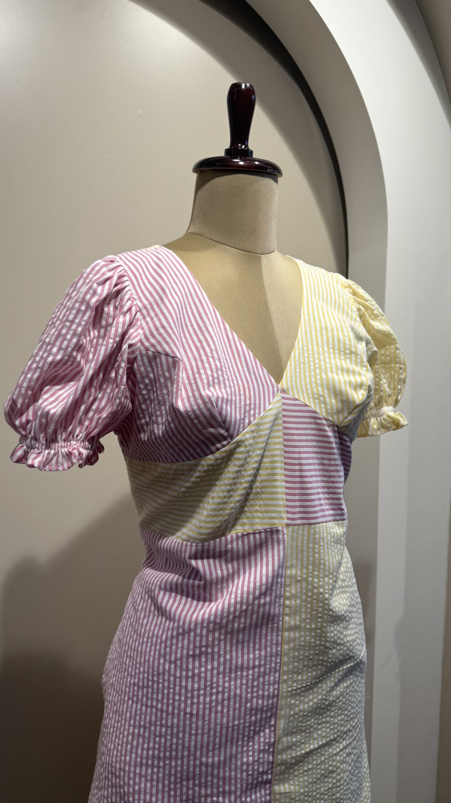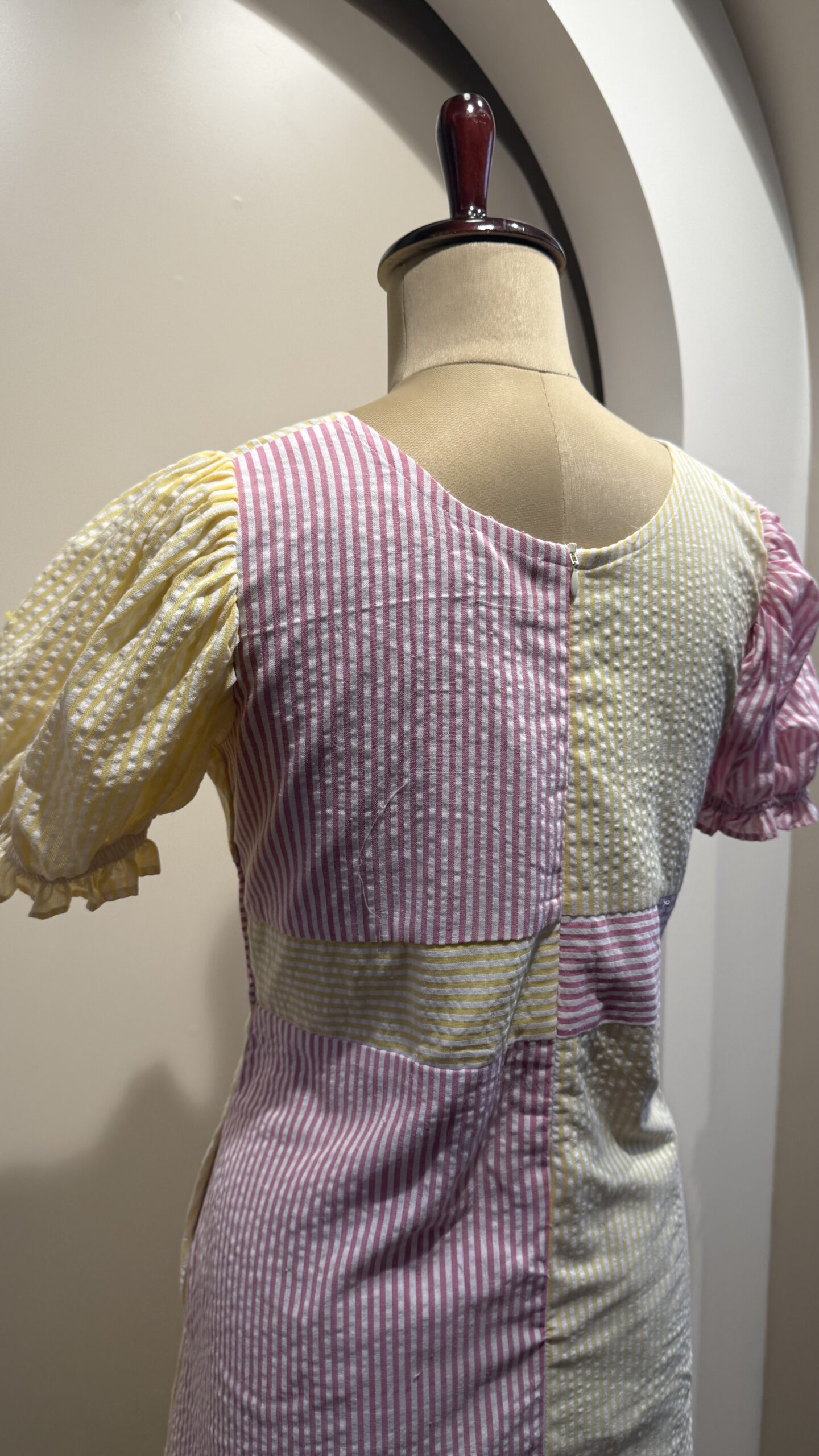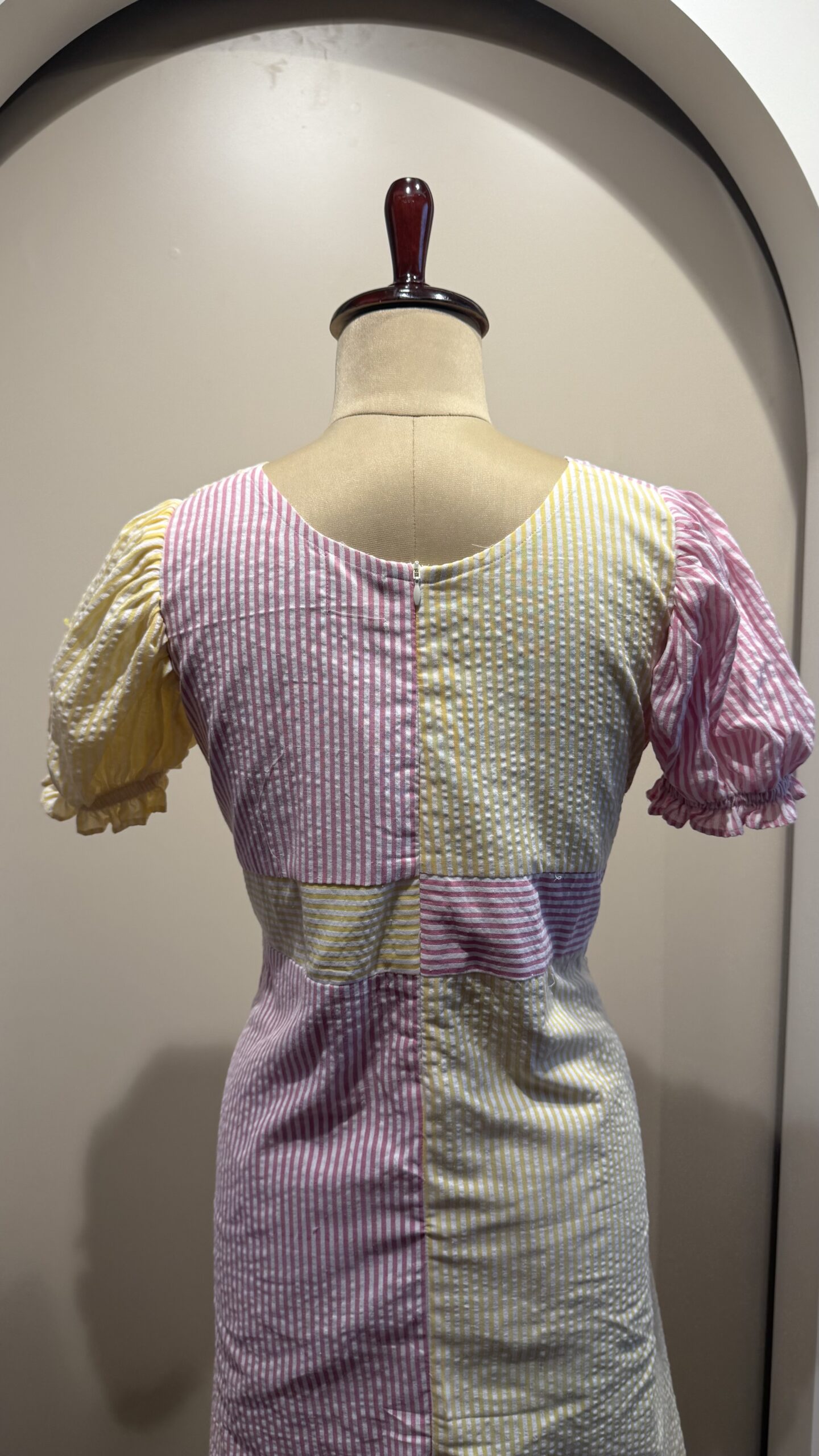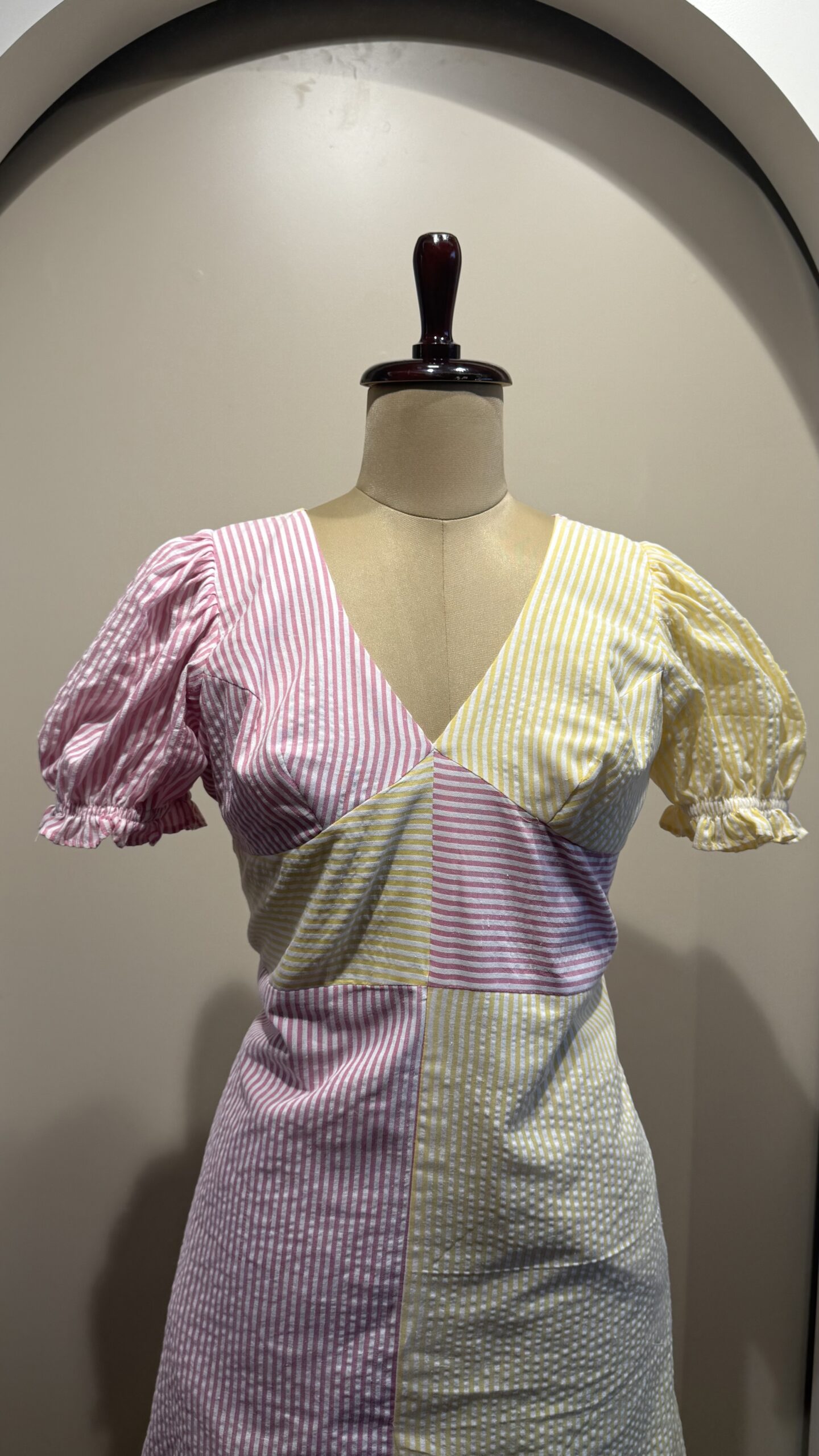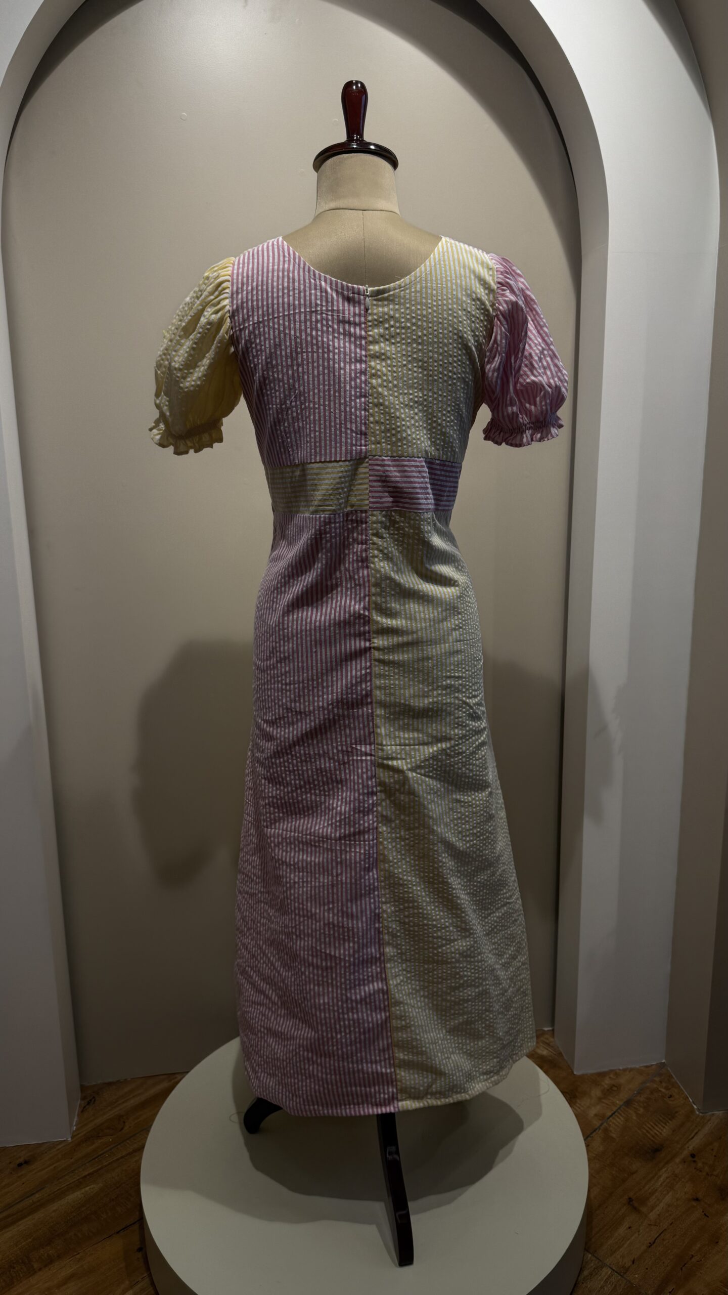 A celebration of refined elegance, this pastel colour block dress is crafted in a harmonious blend of blush pink and soft butter-yellow panels—each placed with couture-level precision. The sculpted V-neckline and elevated empire silhouette contour the body with graceful sophistication, while the voluminous puff sleeves add a touch of romantic luxury.