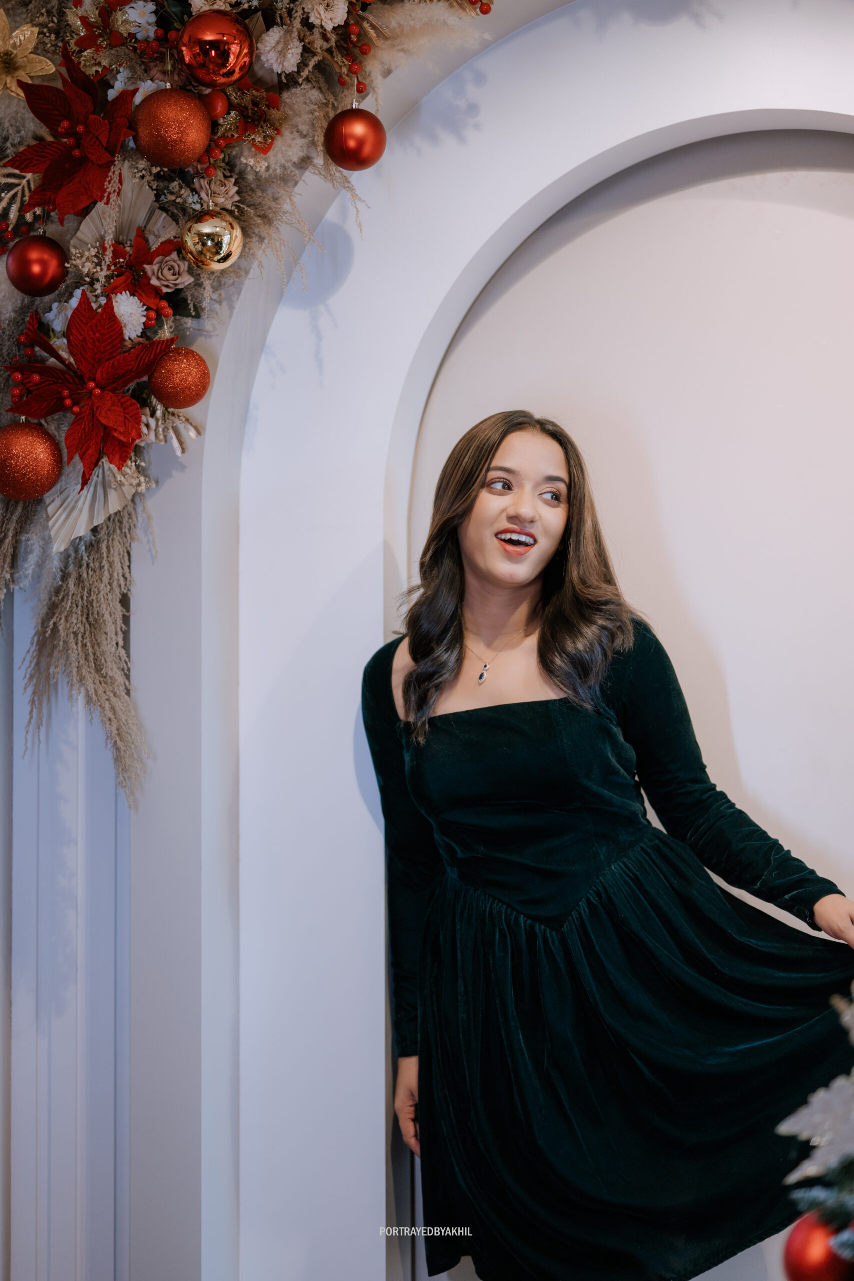 Step into festive elegance with Evergreen Allure, a dark green velvet fit-and-flare dress designed to captivate. Crafted in plush velvet, the dress features a flattering fitted bodice that flows into a graceful flare, creating a timeless and feminine silhouette. The full sleeves add a touch of sophistication, making it perfect for evening celebrations, winter festivities, and elegant gatherings where comfort meets luxury.