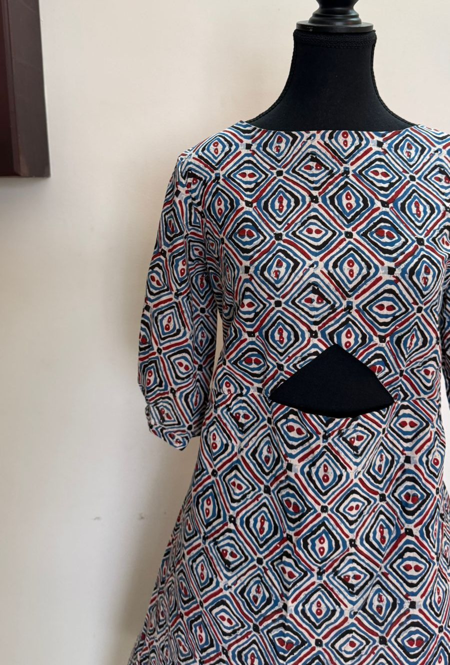 Make a bold fashion statement with our Geometric Print Cut-Out Dress, designed for women who love chic and contemporary styles. Crafted in breathable hand block cotton with eye-catching geometric patterns, this dress features a trendy cut-out detail that adds a touch of modern flair. Perfect for casual outings, parties, or festive occasions, it comes in size XL (42) and offers both comfort and elegance.