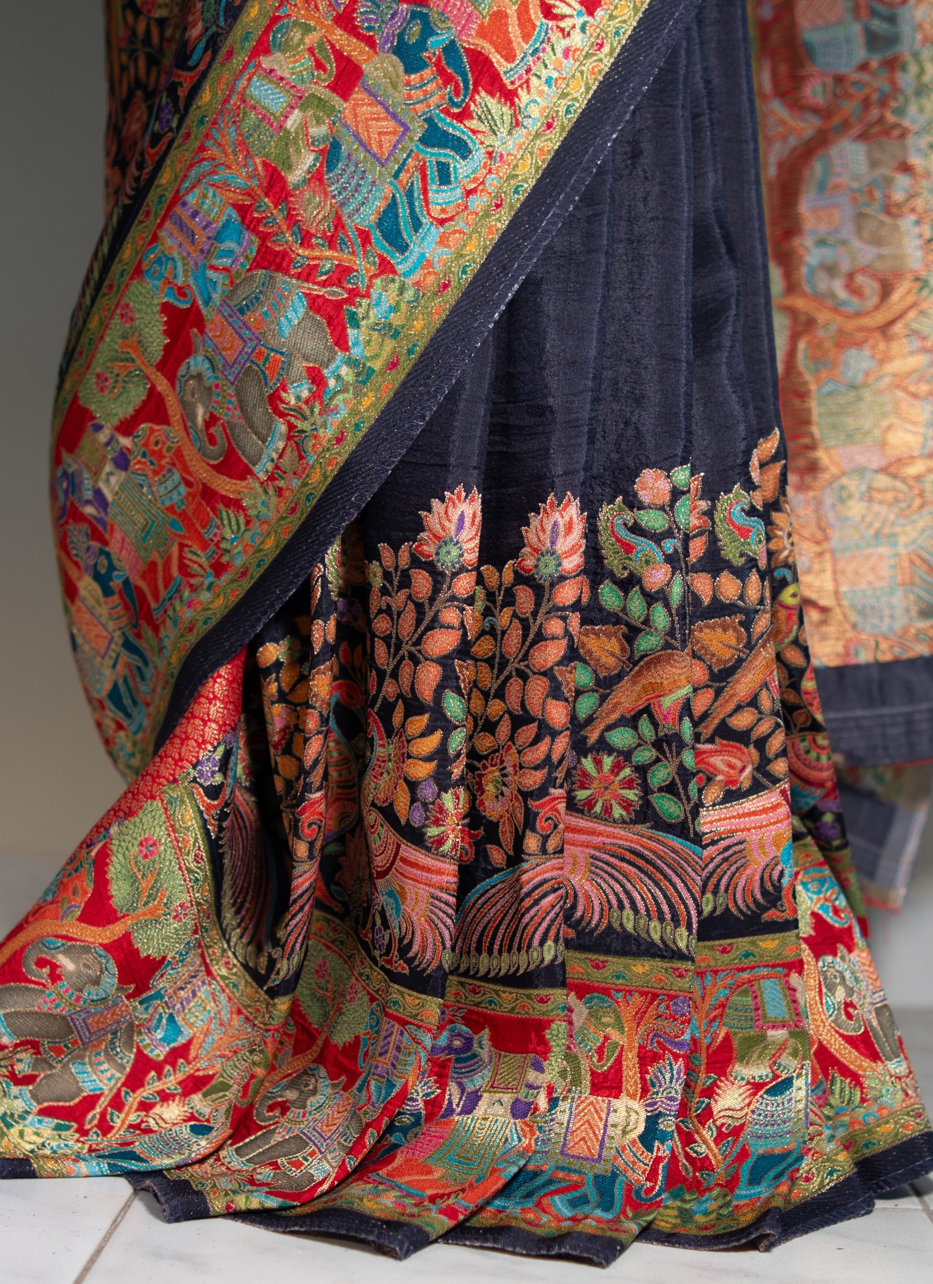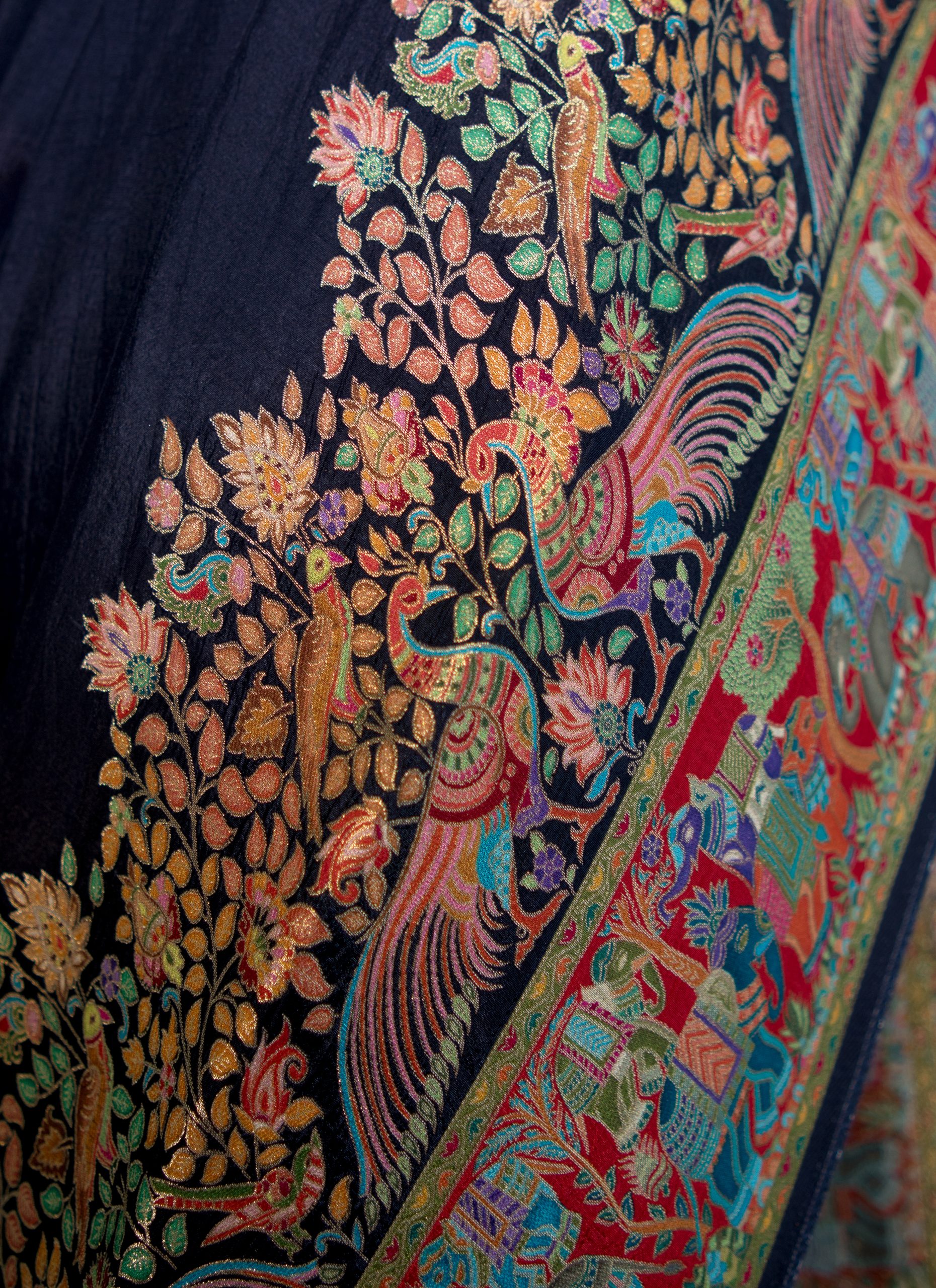 Design: Intricate Peacock & Floral Embroidery with Contrasting Border