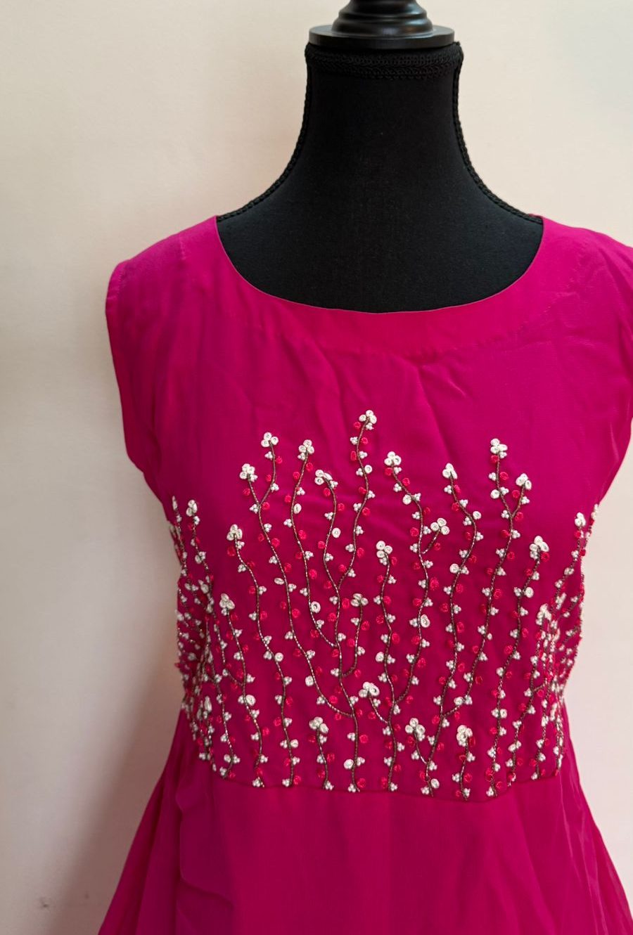Elevate your style with our Rani Pink Sleeveless Dress, a timeless piece that blends traditional craftsmanship with modern elegance. Hand-embroidered with pearl beads and intricate thread work, this dress is made from premium Georgette, offering a graceful flow and comfortable wear. Perfect for celebrations, parties, or festive gatherings, it’s a wardrobe essential for those who love sophistication with a touch of sparkle.