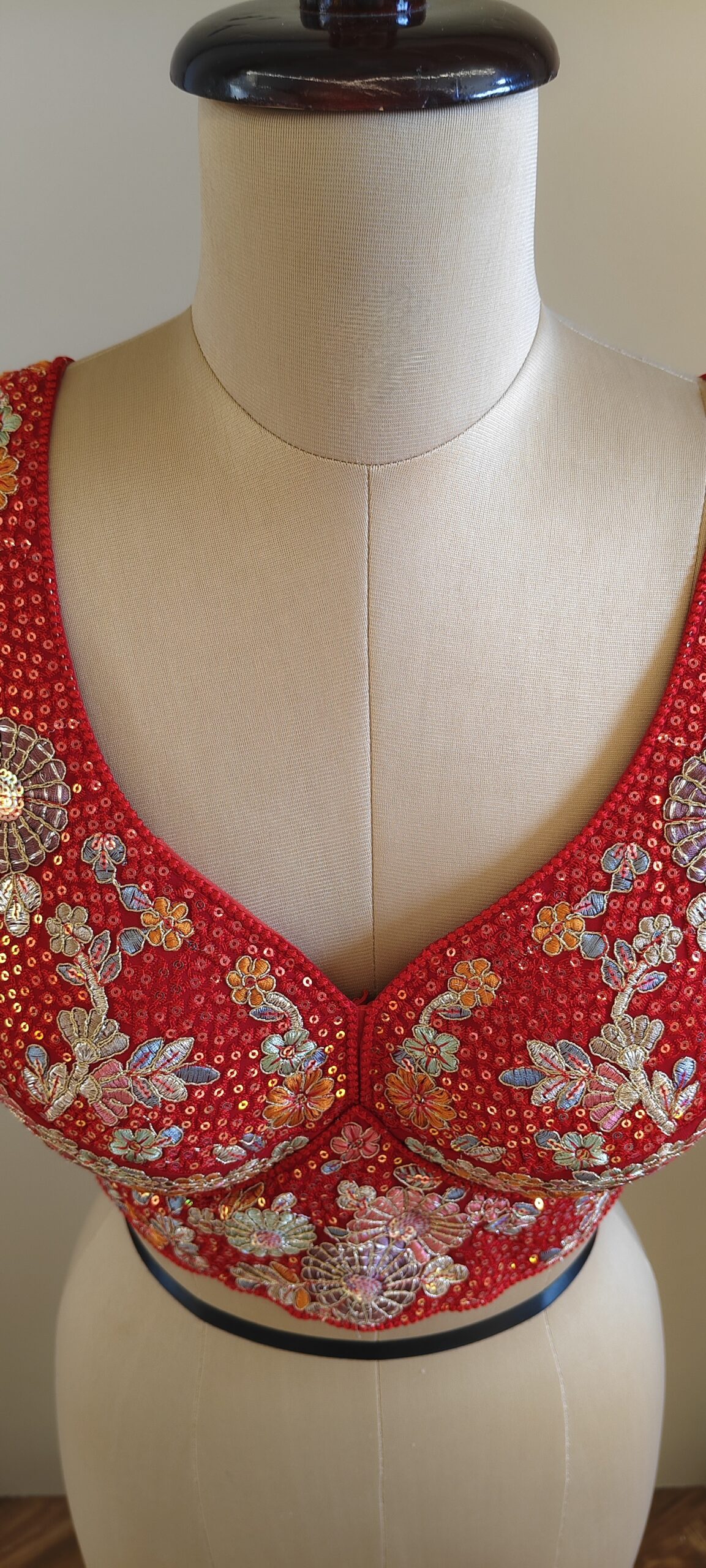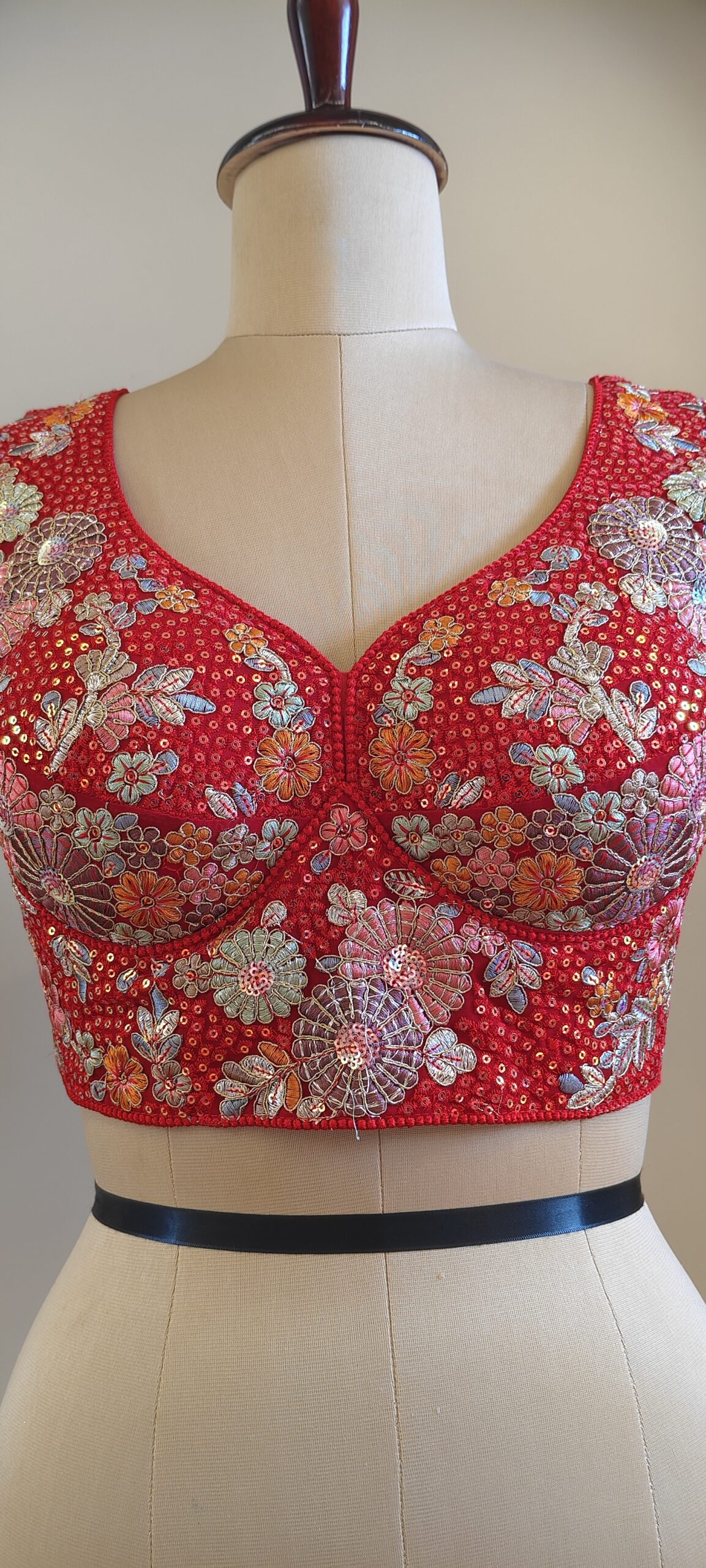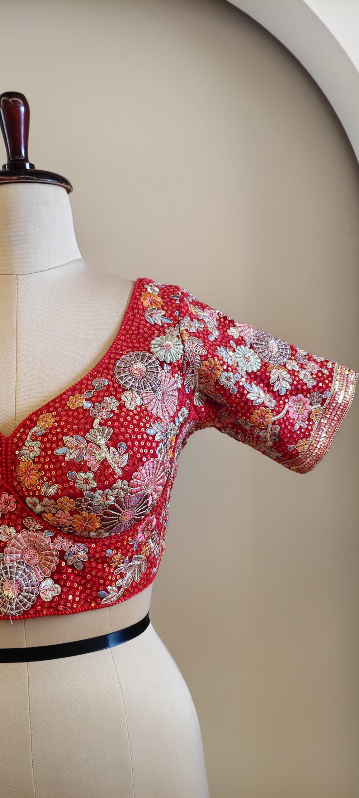 Elevate your ethnic wardrobe with our Ruby Bloom Hand-Embroidered Blouse, a masterpiece crafted for brides, bridesmaids, and festive occasions. Set on a rich ruby red base, this blouse features intricate floral embroidery highlighted with sequins and thread-work, that add a luminous sparkle to every movement.
