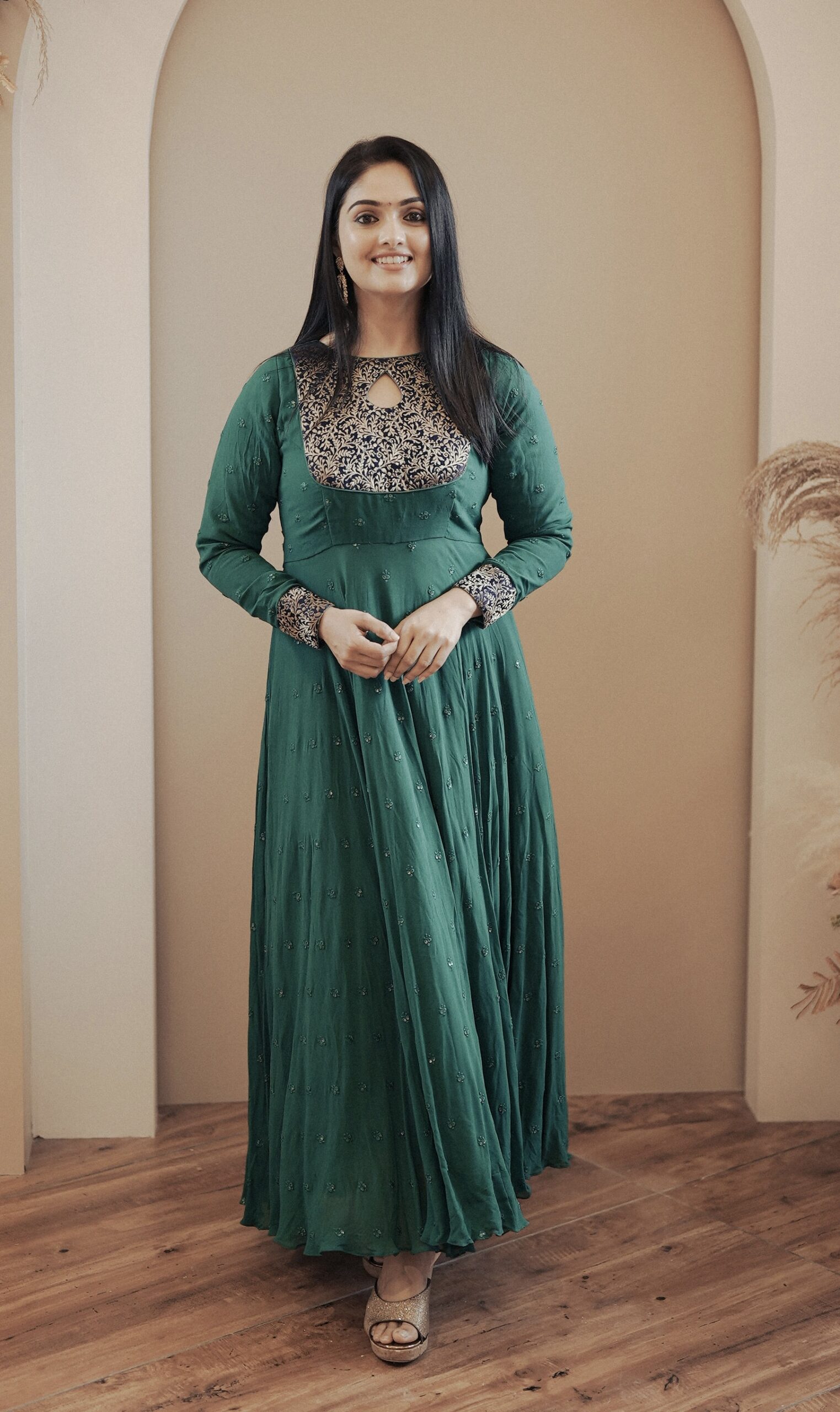• Teal green Anarkali with a rich navy brocade yoke