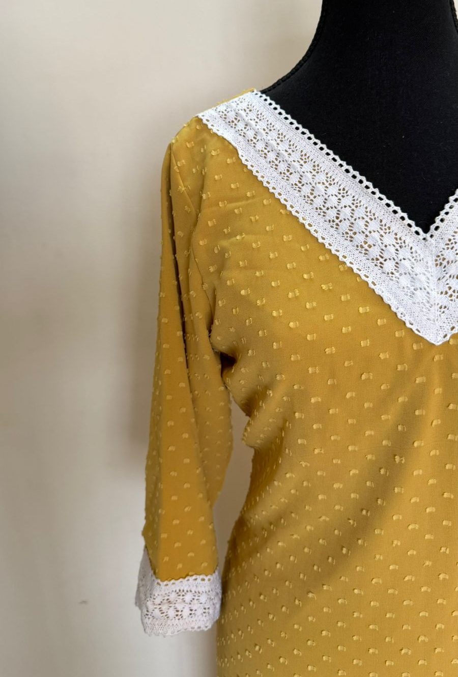 Elegant Neckline: V-neck with delicate lace detailing for a refined look.